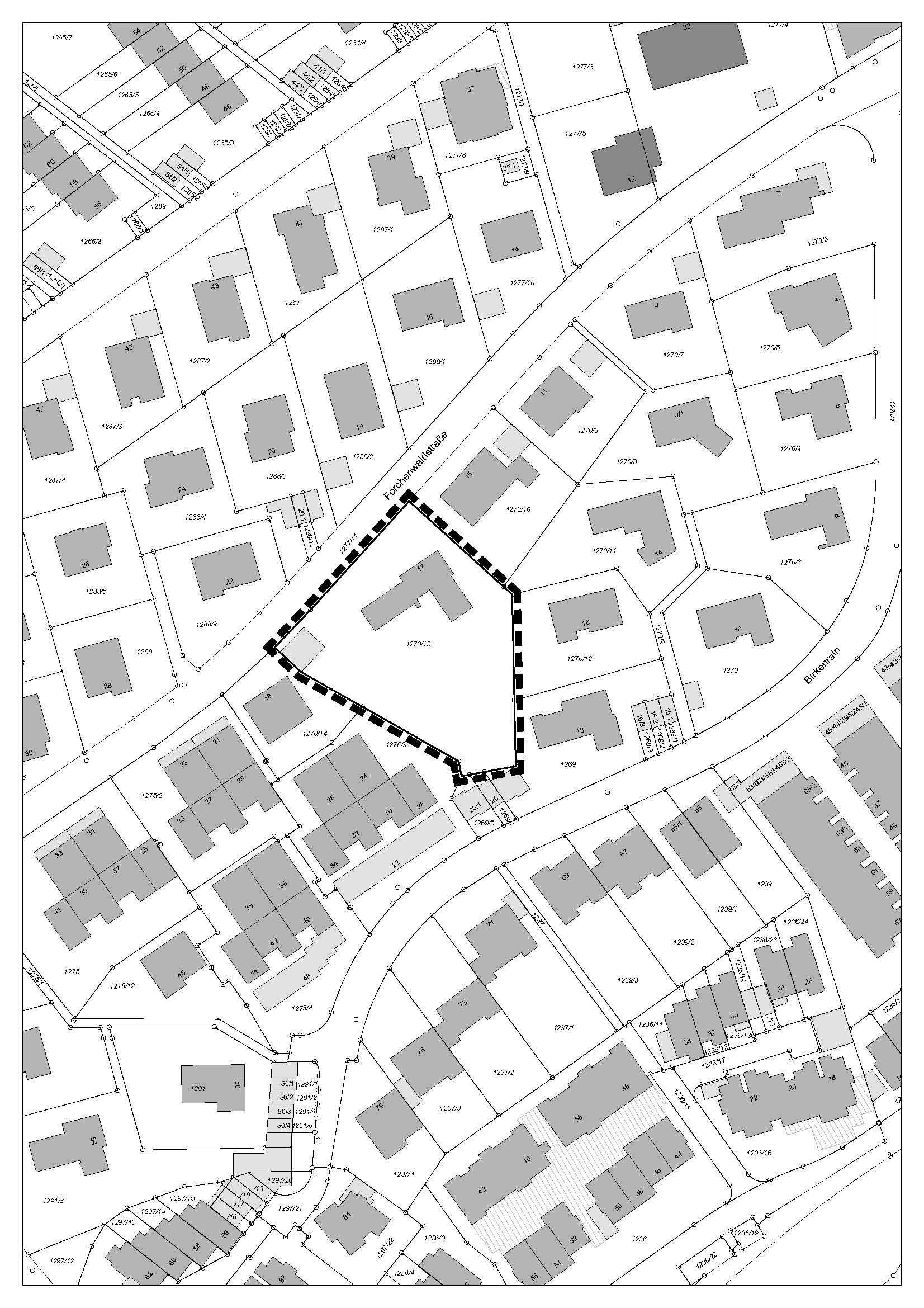 Die Objektplanung Gebäude (Grobplanung) sieht den Abbruch des Einfamilienwohnhauses vor, sowie den Neubau von zwei Mehrfamilienhäusern, gegliedert in drei Bauteile. Die Umgebungsbebauung ist gekennzeichnet durch die nordöstlich und östlich angrenzenden Einfamilienwohnhäuser und auch Mehrfamilienhäuser entlang der Forchenwaldstraße sowie die südwestlich angrenzenden Terrassenhäuser. Die zwei geplanten Mehrfamilienhäuser staffeln sich zur Straße Birkenrain hin ab. Beide Gebäude folgen einer klassischen Teilung in Sockel, Hauptbaukörper und deutlich zurückgesetztem Dach- bzw. Staffelgeschoss. Diese Gliederung wird architektonisch besonders herausgearbeitet und verstärkt die vorhandene Maßstäblichkeit.
