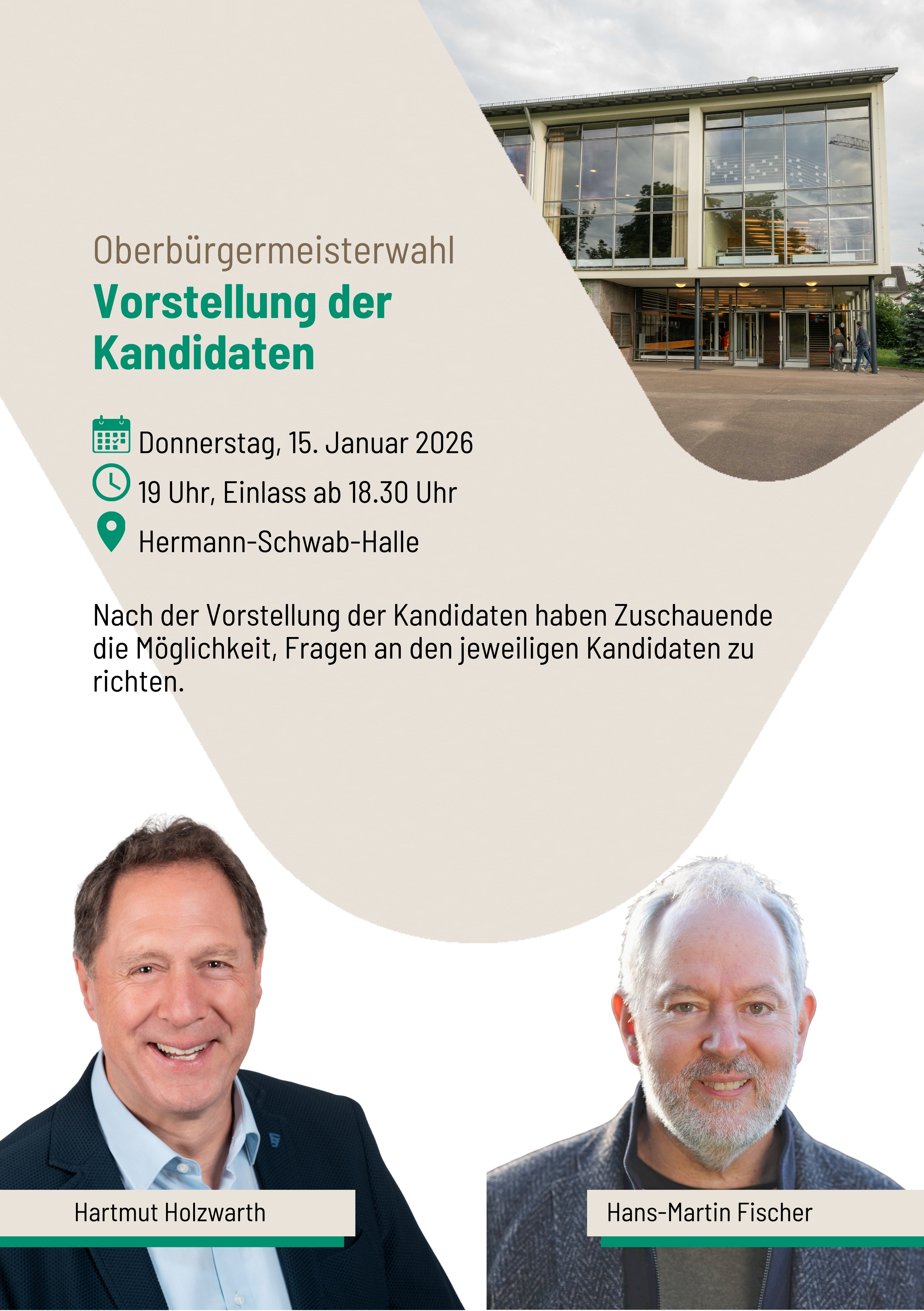 Die Bewerber um die Stelle des Oberbürgermeisters der Stadt Winnenden haben am Donnerstag, 15. Januar 2026, Beginn 19.00 Uhr, die Gelegenheit, sich der Bürgerschaft in öffentlicher Versammlung in der Hermann-Schwab-Halle (Albertviller Straße in Winnenden) vorzustellen.