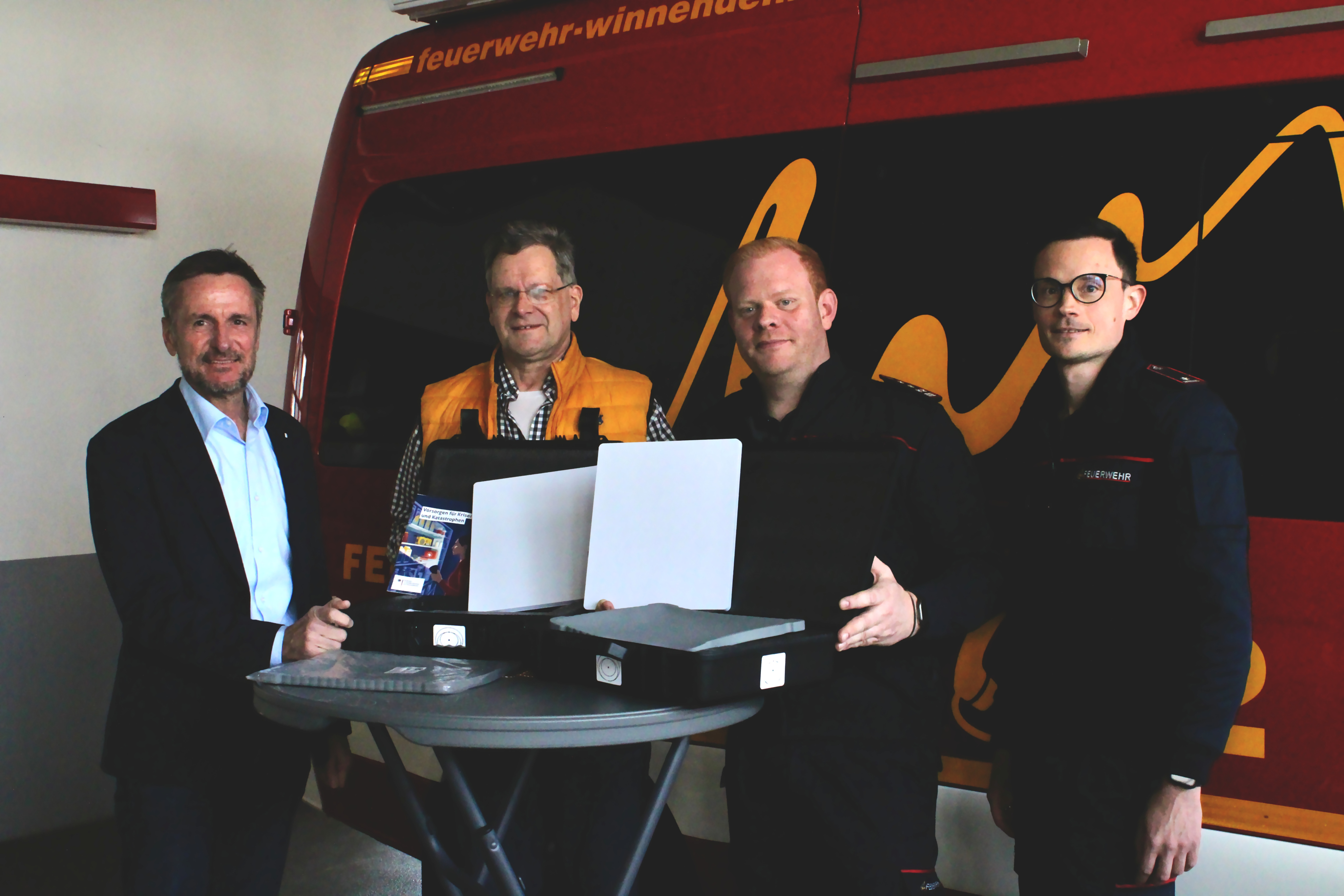 Wie essenziell funktionierende Kommunikationswege in Krisenlagen sind, hat Eilert Pfleiderer selbst erlebt, als er im Juli 2021 den Menschen im Ahrtal zur Hilfe eilte. Als Konsequenz daraus spendete er bereits im November 2025 dem DRK Winnenden einen Starlink-Mini. Nun übergab er auch der Stadtverwaltung und der Freiwilligen Feuerwehr jeweils ein Gerät. Bürgermeister Jürgen Haas sowie Feuerwehrkommandant Tobias Distler und sein Stellvertreter Philipp Vögele dankten herzlich für diese großzügige Unterstützung. „Auch wenn wir alle hoffen, nie in eine Lage zu kommen, in der wir außerhalb von Übungen auf die Geräte zurückgreifen müssen, sind sie eine wichtige Ergänzung für den Bevölkerungsschutz“, so Feuerwehrkommandant Tobias Distler.